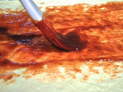 - Теперь берем кусочек дрожжевого теста, что касается этого ингредиенты, вы можете приготовить его самостоятельно по этому рецепту или приобрести уже готовое тесто в любом супермаркете. В принципе для этих малюток подойдет любое дрожжевое тесто на воде, на кефире, на молоке или на сметане. Кладем мучной полуфабрикат на столешницу, посыпанную 1 столовой ложкой пшеничной муки, и раскатываем его с помощью скалки в большой прямоугольник толщиной до 5 миллиметров. На поверхность раскатанного теста кладем столовую ложку кетчупа и распределяем ароматную массу пекарской кистью по всему периметру пласта ровным слоем.