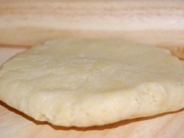 - Воспользовавшись скалкой, раскатываем из теста круг толщиной примерно 1-1,5 сантиметра. Внимание: пласт должен получиться по размеру таким, чтобы его края заходили на борта формы для запекания.