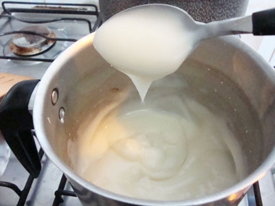 - Получившаяся белоснежная масса должна быть похожа на очень густые сливки, как только она примет такую текстуру снимаем сотейник с плиты, ставим его на разделочную доску, уложенную на столешницу, и даем пудингу немного остыть.