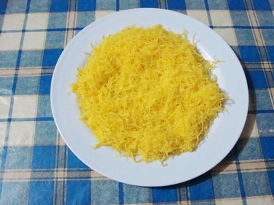 - После с помощью шумовки достаем яичную пряжу из горячей жидкости, перекладываем ее на противень застеленный пергаментной бумагой и разравниваем ее столовой вилкой, для того чтобы пряжа не слиплась. Тем же способом готовим вторую порцию яичной пряжи. После того как это украшение будет полностью готово, ставим противень возле окна и остужаем, а также подсушиваем яичную пряжу.
