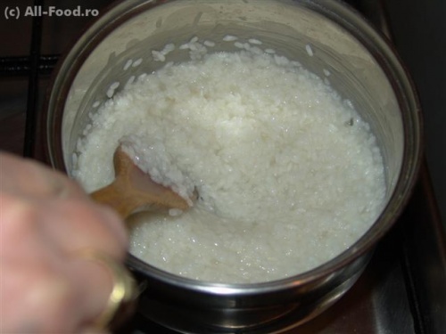 - Затем кладем в закипевшее молоко соль, сахар, а также уже слегка остывший рис и варим его, помешивая, 20 – 25 минут.