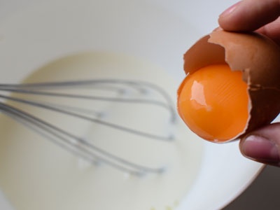 - Берем куриные яйца, их количество зависит от размера, если яйцо большое тогда 1 штука, если маленькое тогда 2 яйца. Разбиваем кухонным ножом, отделяем белок от желтка и последний добавляем в миску с молоком и крахмалом. Вооружаемся венчиком и взбиваем все продукты в миске до однородной воздушной массы, уделяем этому процессу не более 1 минуты к этому времени уже должно закипеть молоко.