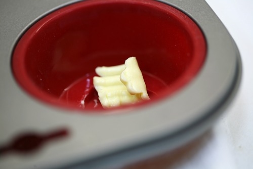 - Положите кусочек масла в каждую формочку, отправьте их в духовку для растапливания масла, примерно на 5 минут.