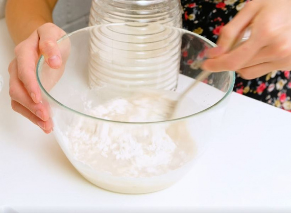 - Дрожжи и сахар растворить в теплой воде, добавить 3-4 ст.л. муки, все перемешать, оставить на 15 минут.