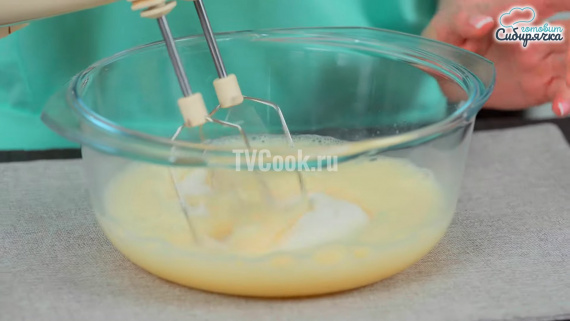 Высыпаем в миску 120 гр. сахара и продолжаем взбивать все ингредиенты до пышной белой массы.