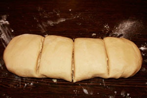 Спустя нужное время включаем духовку на разогрев в 180 градусов Цельсия и застилаем 3–4 небольших противня размером 23 на 25 сантиметров листами пекарской бумаги. Потом выкладываем на столешницу тесто и скатываем его колбаской. Затем металлическим кухонным шпателем делим мучной полуфабрикат на нужное количество частей. Периодически притрушивая пальцы мукой, разравниваем каждый кусочек на отдельном противне, так чтобы получилась основа толщиной около 1–1,5 сантиметров, и идем дальше.