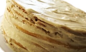 - Ставим на блюдо первый корж и смазываем кремом, и так чередуем все коржи. Последний (12-ый) корж смазывать кремом не надо.
