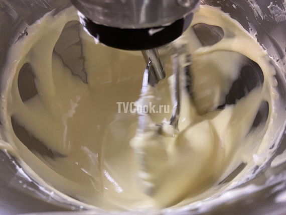 Когда клубничное желе застынет, начинайте приготовления крема. Первым делом взбейте жирные сливки с сыром маскарпоне. В конце добавьте сахарную пудру и продолжайте взбивать до получения густой консистенции.