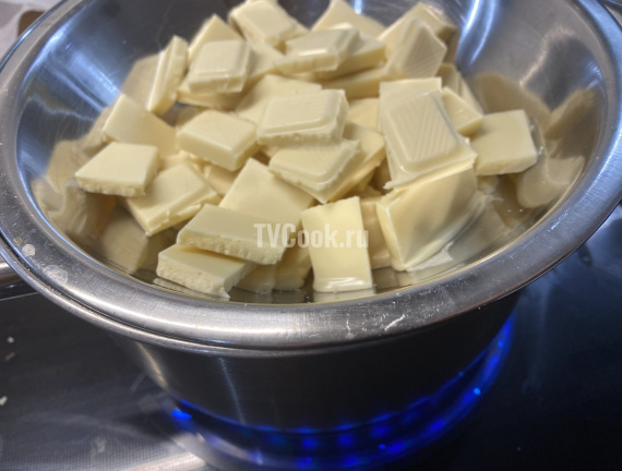 Когда торт пропитается, начинайте готовить ганаш. Сперва на водной бане растопите белый шоколад. Все время перемешивайте, пока шоколад не растает. Отставьте шоколад в сторону, чтобы он слегка остыл.