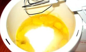 После того, как мы поработали с мукой, откладываем ее в сторону и беремся за следующие важные ингредиенты. Высыпаем сахар в глубокую миску и взбиваем его с яйцами с помощью миксера. Если нет под рукой такого прибора, можно воспользоваться ручным венчиком. Правда это будет немного сложнее, так как по времени это займет примерно 15-25 минут. Это необходимо сделать для того, чтобы наши ингредиенты превратились в воздушную пену и, на дне не попадалось крупинок сахара. Поверьте, это стоит вашего времени и сил. Ведь, чем насыщеннее пена, тем лучше получатся наши песочные коржи.