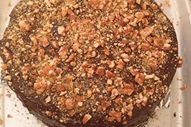 - С помощью длинного ножа разрезаем остывший корж вдоль на два кусочка. Нижнюю часть выкладываем на специальное плоское блюдо для подачи. Воспользовавшись кухонной лопаткой, обильно смазываем поверхность первого коржа кремом (1/2 часть), а затем посыпаем измельченным арахисом так, чтобы еще осталось больше половины.