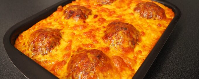 Покрыть фрикадельки соусом, и сверху уложить ломтики сыра чеддер.
