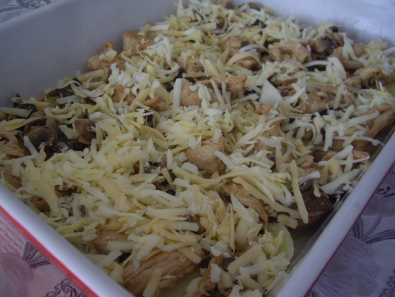 - Смажьте форму для запекания маслом. Картофель очистите от кожуры и нарежьте тонкими кружочками. Теперь соберите запеканку. Первый слой — слой из половины всего картофеля, второй — половина обжаренного куриного филе с грибами и луком, затем оставшийся картофель и оставшееся куриное филе с грибами и луком сверху.
