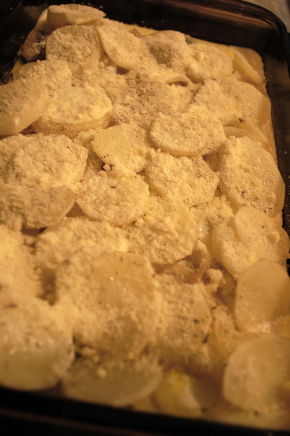 - Поверх картофеля выложите жаренные грибы с луком и чесноком. Вновь посолите и поперчите все по вкусу.