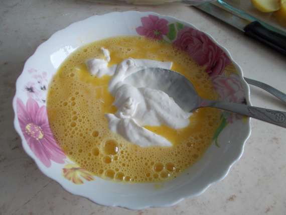 - Взбейте яйца до однородной консистенции, а затем тщательно смешайте их с жирной сметаной. Добавьте соль и перец по вкусу.