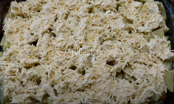 Кабачки порезать чествертькольцами, посолить и поперчить. Помидоры порезать четвертькольцами. Картофель почистить и порезать четверть кольцами. Посолить, поперчить и перемешать.