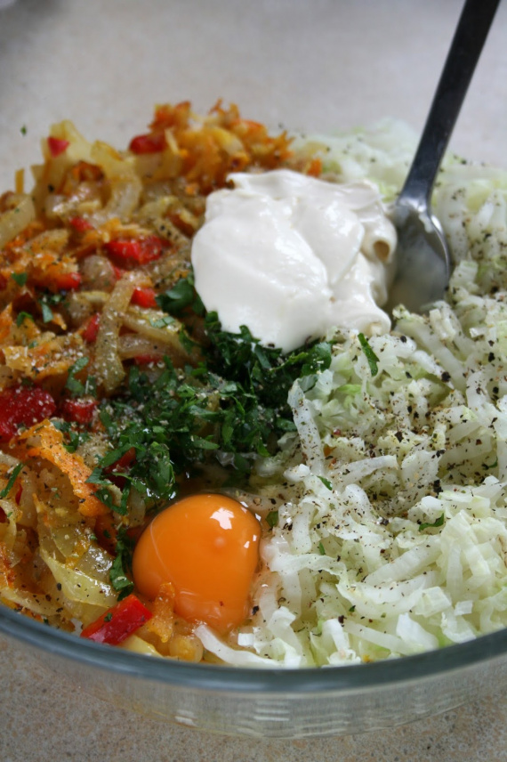 - Добавьте к овощам яйцо, майонез, соль и перец. Очень тщательно все перемешайте, чтобы масса стала более однородной.