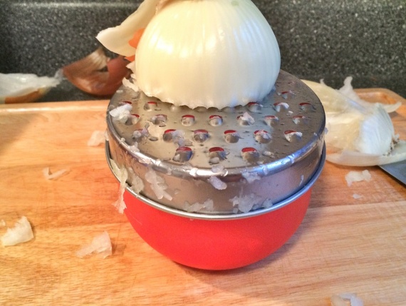 С луковицы снимите шелуху и, сполоснув овощ и терку холодной водой, натрите лук. Если у вас в результате получилось слишком много сока вместе с тертым луком, то, аккуратно придерживая столовой ложкой мякоть, слейте жидкость в раковину.