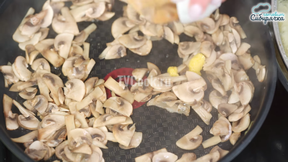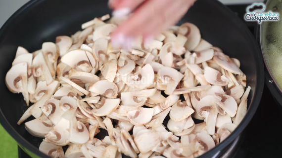 Выкладываем в поставленную на плиту сухую сковороду предварительно нарезанные тонкими слайсами 200 гр. шампиньонов и перемешивая обжариваем их на высоком огне плиты.