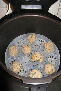 - Теперь устанавливаем на столешнице мультиварку с тефлоновой чашей, в которую сразу вливаем около двух мерных стаканов очищенной воды, устанавливаем на ней корзину-пароварку и смазываем ее дно столовой ложкой растительного масла. Оставшимся жиром смазываем ладони, делим куриный фарш на 8–9 равных частей и формируем овальные, круглые либо конусообразные небольшие котлетки. Отправляем их на дно подготовленной корзины, закрываем мультиварку плотно прилегающей крышкой, вставляем ее штекер в розетку и на светящемся табло выбираем режим «Варка на пару» на 30 минут.