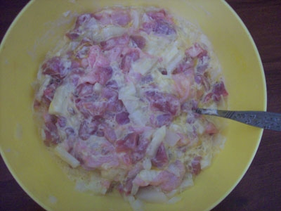 Если вы используете окорока, бедра, то удаляем ножом мясо с костей. Затем филе режем ножом на разделочной доске на маленькие кусочки. Положим кусочки в миску, поперчим, посолим и перемешаем ложкой.