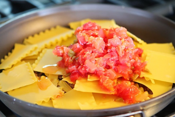 Сразу же, вслед за колбасками добавьте в сковородку листы лазаньи, разломав каждый на четвертинки.