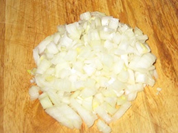 С помощью ножа очищаем лук от шелухи и тщательно промываем под проточной теплой водой. Затем выкладываем компонент на разделочную доску и измельчаем кубиками. Мелко рубленную луковицу пересыпаем в свободную тарелку и на время оставляем в покое.