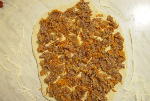 Тесто выкладывается на присыпанную мукой доску и раскатывается скалкой тонким слоем. Чем тоньше будет слой теста, тем вкуснее получится в результате ваше блюдо. Раскатав как можно более тонкую лепешку, выкладываем на не начинку, распределяя ее равномерно по всей поверхности теста. В идеале тесто должно быть почти прозрачным, а слой фарша должен быть плотным, но не чрезмерно толстым. Выложив весь фарш, начинайте аккуратно сворачивать рулет. Не торопитесь, за вами никто не гонится. Скатав весь пласт теста с начинкой, аккуратно защипите края, чтобы не вытекал вкусный мясной сок. Вот и все. Теперь остается только отварить наш ханум.