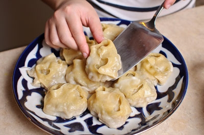 - Если вы готовите манты сами, непосредственно после нарезки теста на квадраты, лучше отделить небольшую часть от общей массы и слепить из мучных квадратиков манты. Остальную часть теста, во время лепки, предпочтительней накрыть полиэтиленовой пищевой пленкой для того, чтобы тесто не подсыхало.