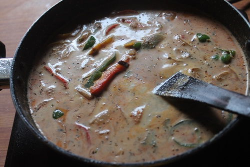 - В курицу с овощами влейте молоко и очень хорошо перемешайте все.