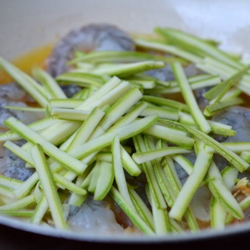 - Сперва вам нужно будет очистить от панциря и головы креветки и частично снять кожуру с кабачков или цукини (смотря, что вы используете). Очистите так же зубчики чеснока от шелухи. А спагетти надо бросить в кипящую подсоленную воду и отварить почти до готовности. Просто готовьте их на 30 секунд или 1 минуту меньше, чем указано на упаковке.
