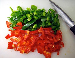 Промываем болгарский перец под проточной водой и выкладываем на разделочную доску. С помощью ножа удаляем хвостик и семена. Теперь измельчаем овощ тонкими полосками. Для этого разрезаем его вдоль на две части, а затем каждую еще пополам. Мелко рубленный перец перемещаем в чистую тарелку и на время оставляем в стороне. Внимание: по цвету можно брать овощ такой, какой вам больше нравится. Вкус от этого у плова точно не изменится.