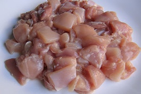 Куриное филе тщательно промываем под проточной теплой водой и после выкладываем на разделочную доску. С помощью ножа очищаем мясо от жира, жил, пленок и хрящей. Затем нарезаем компонент небольшими кусочками и перемещаем в маленькую миску.