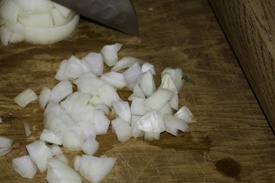 С помощью ножа очищаем лук от шелухи и тщательно промываем под проточной водой. Выкладываем компонент на разделочную доску и мелко рубим квадратиками. Измельченную луковицу пересыпаем в чистую тарелку.