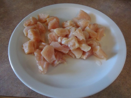- В сковороду наливаем немного оливкового масла и ставим на конфорку. Включаем плиту на средний уровень и ждем когда масло разогреется. Как только это произошло, выкладываем нарезанный лук и обжариваем его в течение 2 — 3 минут до размягчения и легкого золотистого цвета. Затем перекладываем курицу и обжариваем кусочки вместе с луком до тех пор, пока они не приобретут белый оттенок, не забывая при этом перемешивать все кухонной лопаткой.