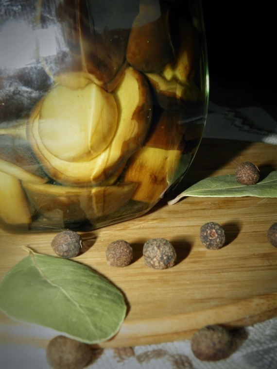 Подготовьте стеклянные банки, простерилизовав их любым удобным для вас способом. На дно подготовленных банок уложите часть специй. Затем слой грибов и снова слой специй и зелень. Это нужно для того, чтобы грибы в банках равномерно пропитались ароматом и вкусом чеснока, перца, лаврового листа и так далее. Таким образом, слоями, заполните стеклянную банку по плечики. Затем столовой ложкой слегка прижмите грибы сверху и слейте лишнюю воду. Разместите на самом верху лавровый лист, залейте в баночки растительное масло, его слой должен быть около 5-7 миллиметров в высоту, и закупорьте (но не намертво) заготовки крышками. На всякий случай, если вдруг при брожении сок начнет вытекать через край, каждую банку нужно поставить в крепкий полиэтиленовый пакет.