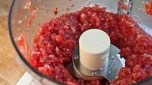 - Теперь разрезаем компоненты на четыре части и перемещаем в кухонный комбайн или блендер. Измельчаем помидоры на малой скорости так, чтобы из них получилась жидкая масса с кусочками. В конце переливаем все обратно в чистую маленькую миску и переходим к подготовке чеснока.