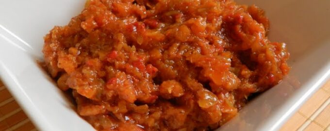 Перцы запеките до черноты на шкурке с помощью духовки или на открытом огне. После переложите овощи в контейнер, присолите и закройте. Когда перцы остынут, вы без труда очистите их от кожицы и семян. Очищенные перцы нарежьте мелко.