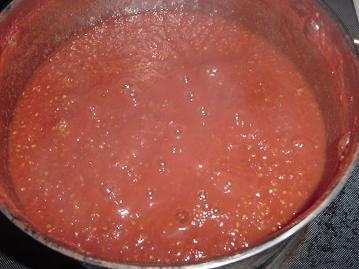 - Перекручиваем помидоры на мясорубке со средними отверстиями (или пользуемся блендером), получившуюся массу выливаем в казан и даём закипеть.