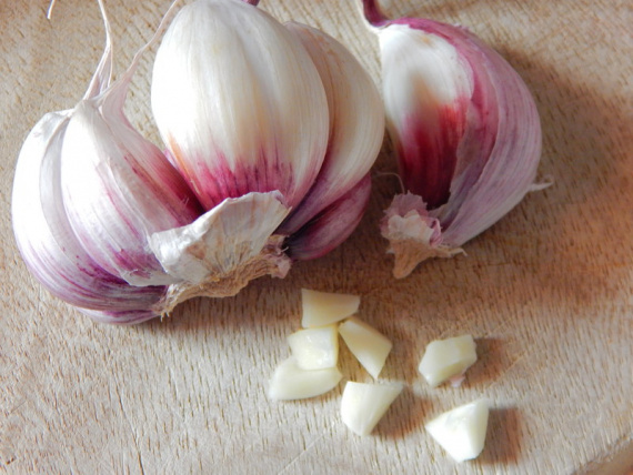 - Головку чеснока разберите на зубчики, очистите их от шелухи и нарежьте ножом на мелкие кубики.
