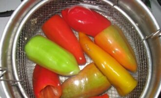 - Бланшируйте сладкий перец, налив воду в кастрюлю до половины и доведя до кипения. Пока вода подогревается, помойте перцы, очистите их от семян и стеблей. Поместите перцы в сетку над кипящей водой, чтобы они не касались воды, и бланшируйте 5 – 10 минут.