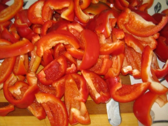 - Болгарские перцы нужно порезать вдоль на достаточно крупные по размеру ломтики. Овощи некрупного размера достаточно будет лишь разделить на половинки.