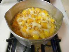 - По истечении отведенного времени аккуратно сливаем сироп обратно в эмалированную кастрюльку и ставим на средний огонь. Даем жидкости повторно закипеть. Сразу же после этого еще раз заливаем данным сиропом кубики дыни и вновь оставляем в стороне настаиваться в течение 10 часов. Внимание: не забываем накрыть миску тканевым полотенцем.