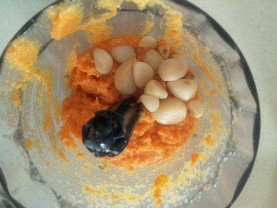 Морковь очистите от шкурки, как следует промойте, нарежьте на небольшие кусочки и измельчите с помощью блендера или мясорубки вместе с чесноком и острым перцем чили.