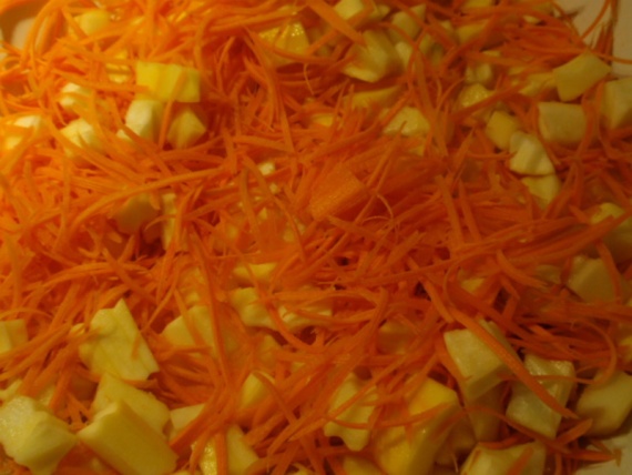 Морковь промойте теплой водой, очистите от шкурки и еще раз сполосните водой. После чистки и мытья измельчите овощ с помощью средней терки или терки для моркови по-корейски. Сразу смешивайте все овощи между собой, по мере их подготовки.