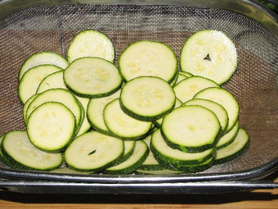 - Нарезанные кабачки нужно посолить, перемешать и оставить в таком виде на 15 минут. Можно в тарелке, можно в дуршлаге или сите.