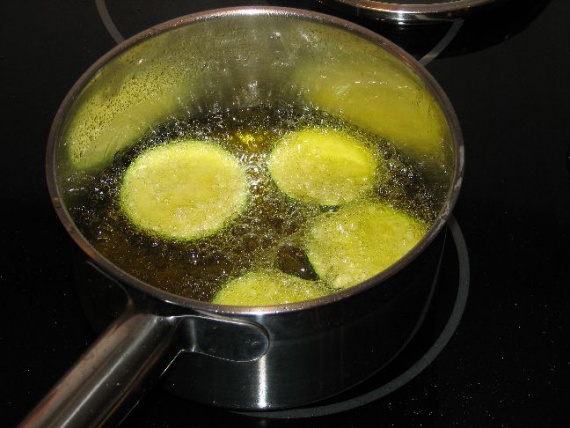 - Жарить кабачки тоже очень просто. Сперва хорошо разогрейте сковородку и влейте в нее 2 столовые ложки растительного масла. Когда масло так же разогреется, выложите в него кружочки кабачков и жарьте их на среднем огне до золотистого цвета. То есть по 3-5 минут с каждой стороны.