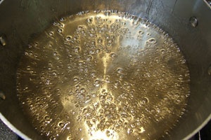 На подготовку посуды уйдет примерно 50–60 минут, ставим ее на кристально чистый стол и перемещаем настоявшиеся овощи на средний огонь. Даем им возможность сильно нагреться, но до кипения не доводим! Тем временем отправляем на соседнюю конфорку глубокий сотейник и вливаем в него все растительное масло и столовый 9% уксус. Туда же добавляем оставшийся сахарный песок, каменную соль, листики лавра и черный перец горошком. Как только смесь закипит, провариваем ее пару минут и снимаем с плиты.