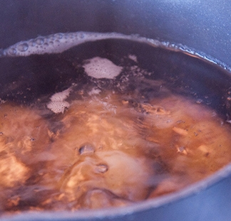 Выкладываем яйца в среднюю кастрюлю и заливаем водой. Ставим емкость на средний огонь. После закипания варим яйца вкрутую еще 10 минут. Выключаем конфорку, а кастрюлю с помощью кухонных прихваток ставим под холодную проточную воду. Это необходимо сделать для того, чтобы впоследствии снять с легкостью яичную скорлупу. Промываем еще раз, чтобы смыть остатки скорлупы.