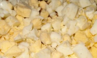 Отваренные куриные яйца нарежьте на кубики среднего размера. Добавьте их в миску с прокрученными ингредиентами. Теперь все тщательно перемешайте, добавьте немного растительного масла. Перец черный молотый добавьте по своему усмотрению и вкусу.